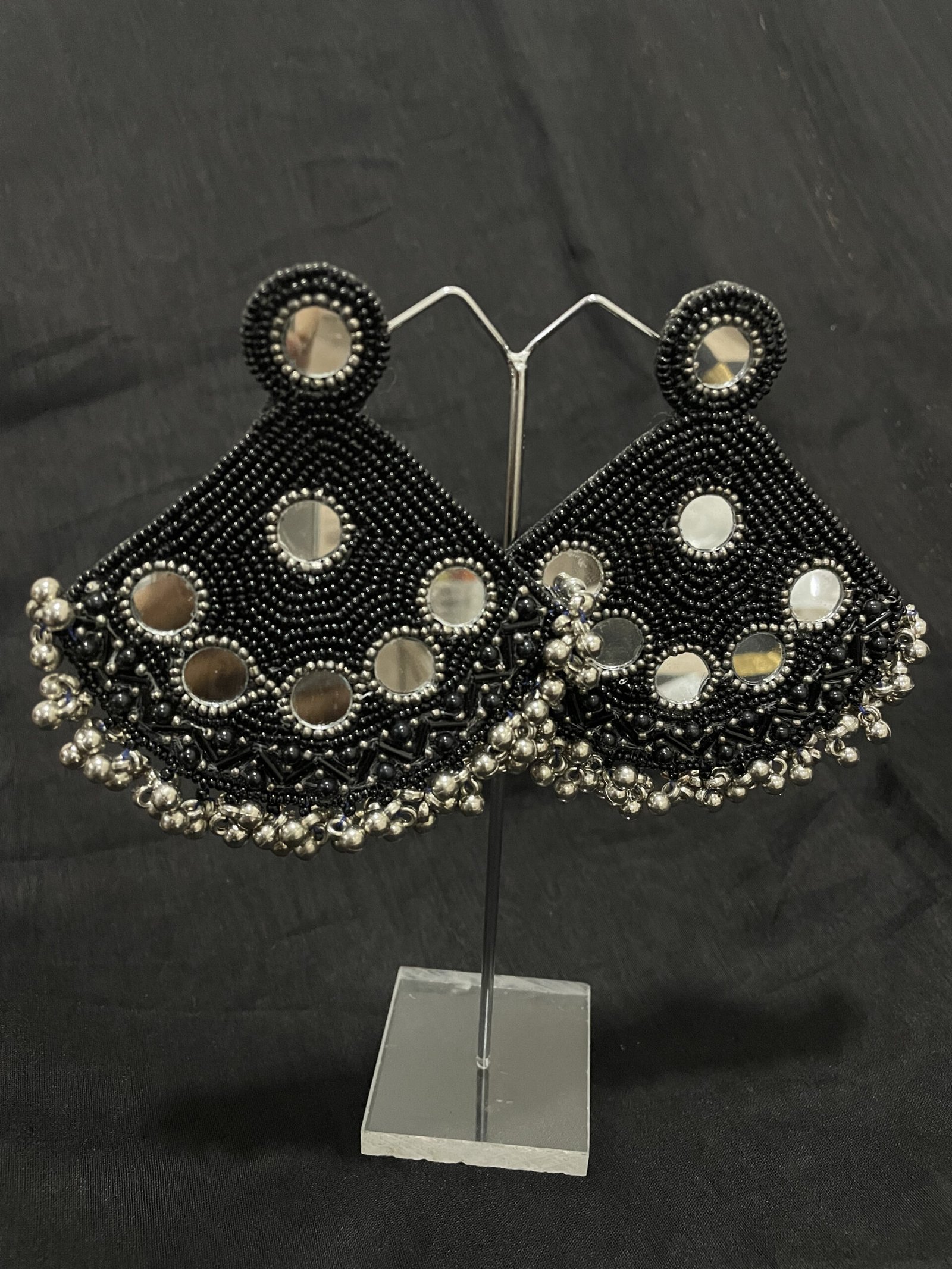 Embrace the bohemian spirit with these stunning black mirror work jhumkas! Featuring a unique design with intricate mirror work and cascading chains, these earrings are sure to add a touch of ethnic charm to any outfit. The black color and mirror embellishments create a mesmerizing effect, making them perfect for special occasions or everyday wear. Perfect for adding a touch of bohemian flair to your look.