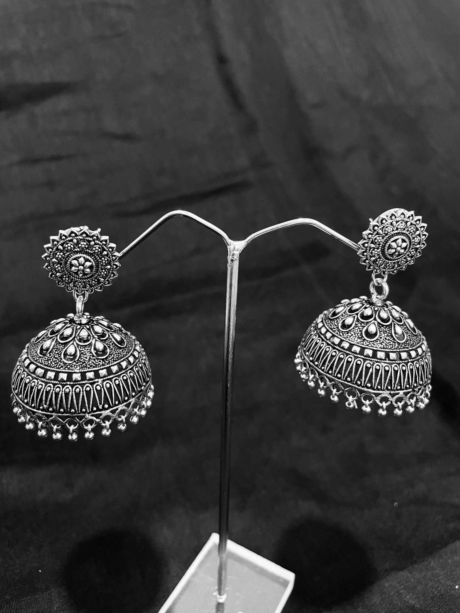 Add timeless charm to your jewelry collection with these elegant Oxidized Dome-Shaped Jhumka Earrings. Featuring a stunning intricate floral pattern on the stud top and beautifully detailed dome-shaped jhumkas, these earrings capture the essence of traditional Indian craftsmanship. Each jhumka is adorned with delicate dangling beads for a classic ethnic look, making them perfect for festive occasions, weddings, and cultural celebrations. The lightweight design ensures comfort, while the oxidized silver finish adds a touch of vintage elegance.