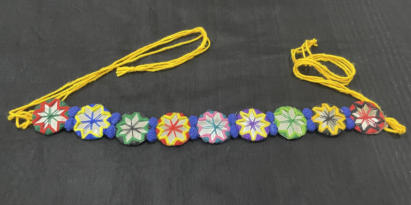- Intricate Mirror Detailing: Each segment is adorned with reflective mirror work, enhancing the belt’s festive charm and adding sparkle to your ensemble.